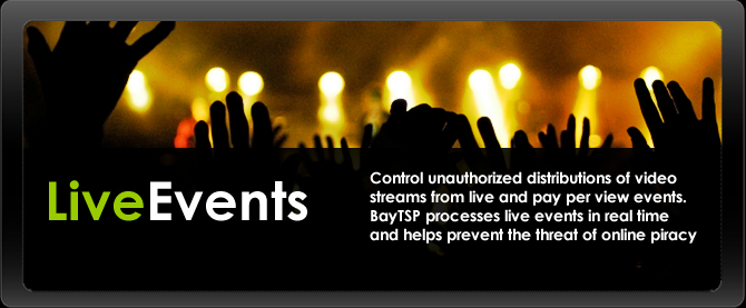 Concerts, sports events and pay-per-view broadcasts are seeing increasing unauthorized distribution via online streaming sites. BayTSP works with clients to identify unauthorized sites and take action against them, driving viewers to authorized, revenue generating sites.